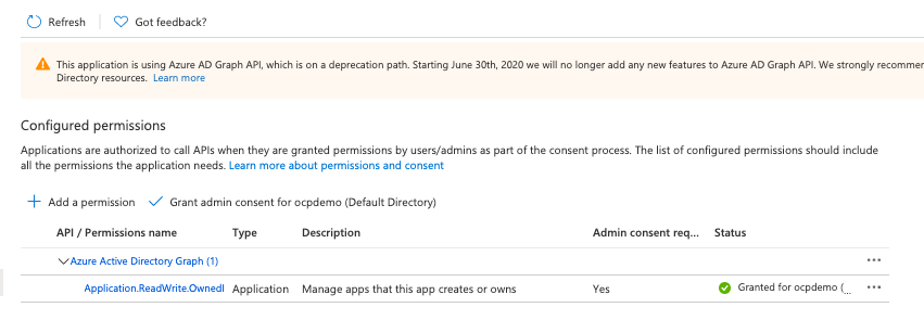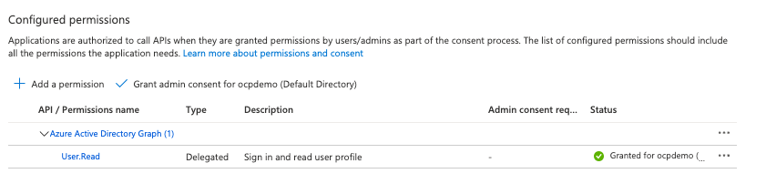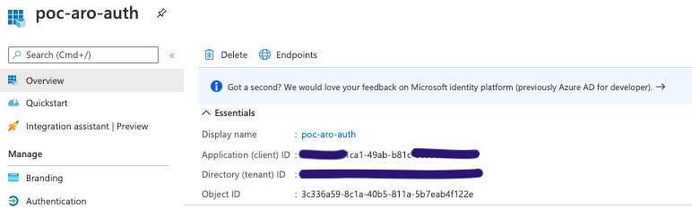 az ad app create \ --query appId -o tsv \ --display-name poc-aro-auth \ --reply-urls $oauthCallBackURL \ --password '<ClientSecret>'Note: Please note that the above command returns the registered Application Id (AppId) which you will need it when configuring the OAuth on OpenShift.