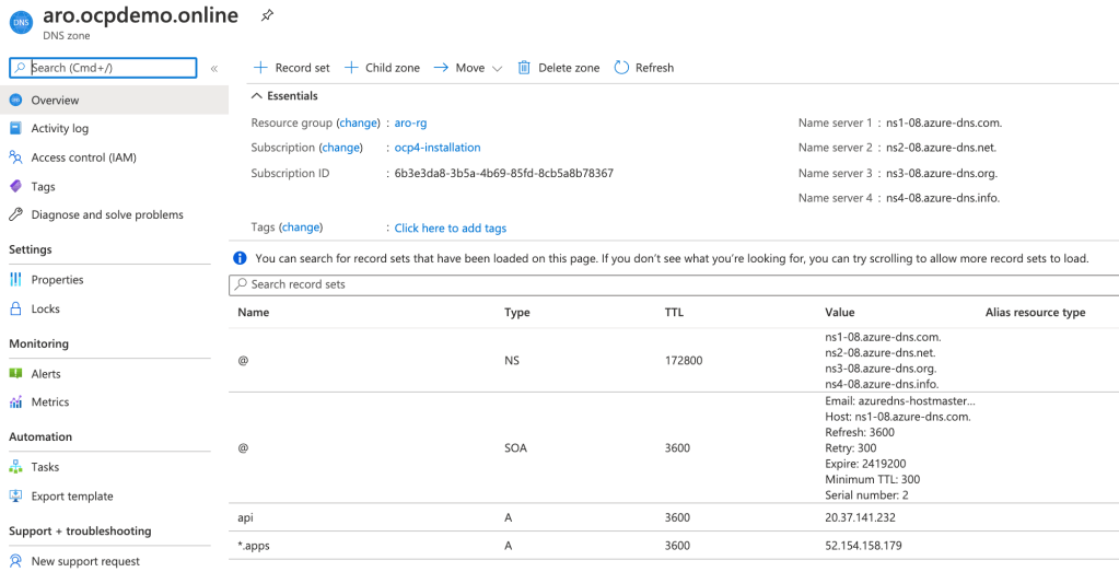 - IP: the *.apps/ingress IP is from the output of the creation of the ARO