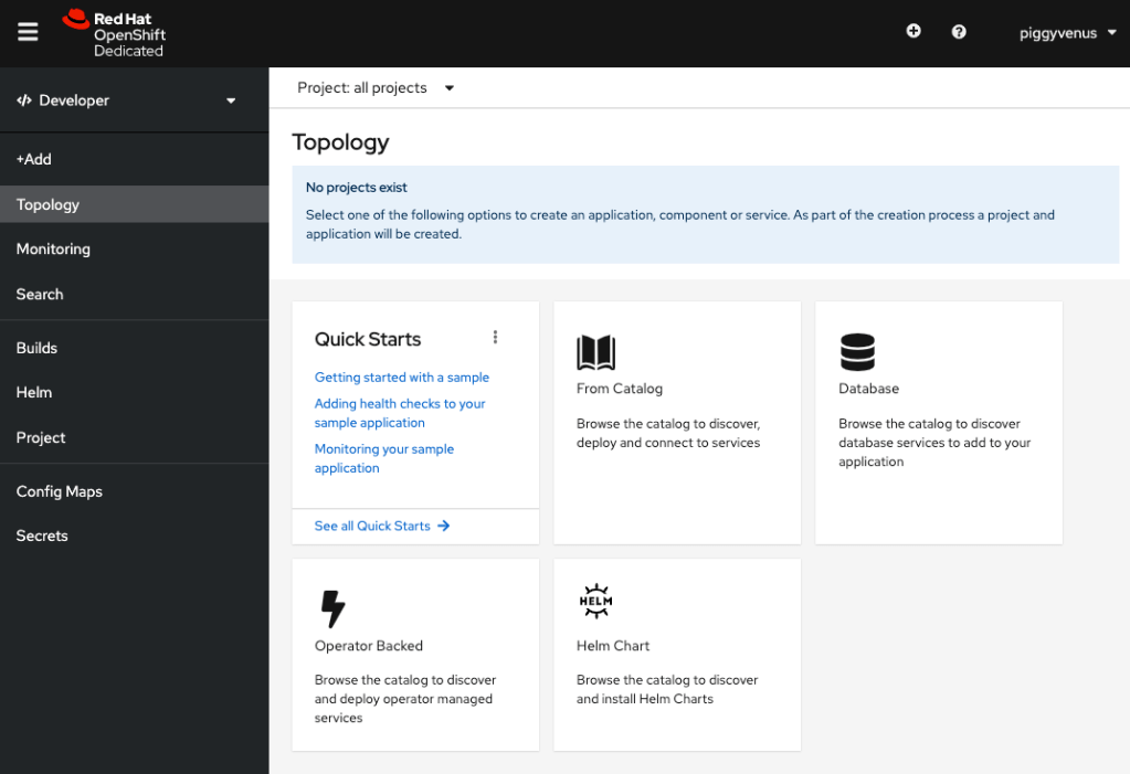 - Once you log in with your Github credential, we will see the OCP developer console: