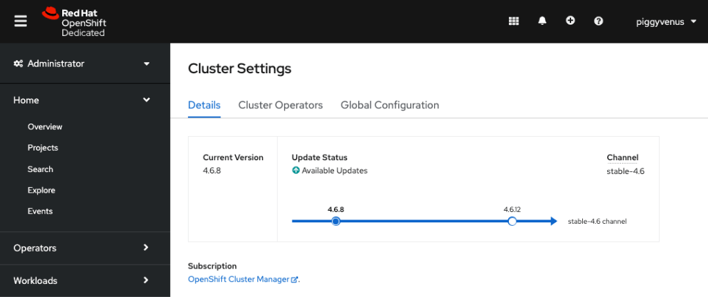 rosa grant user cluster-admin --user <github user in your organization> --cluster <name of your rosa cluster>. - Click Administrator on the top left and access the OCP admin console with Admin access as shown below: