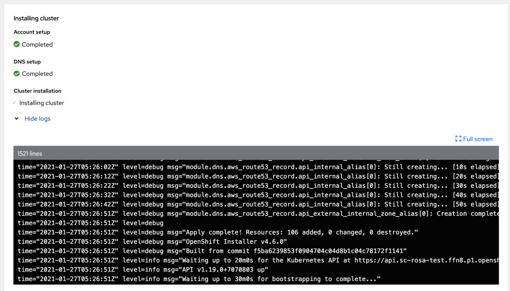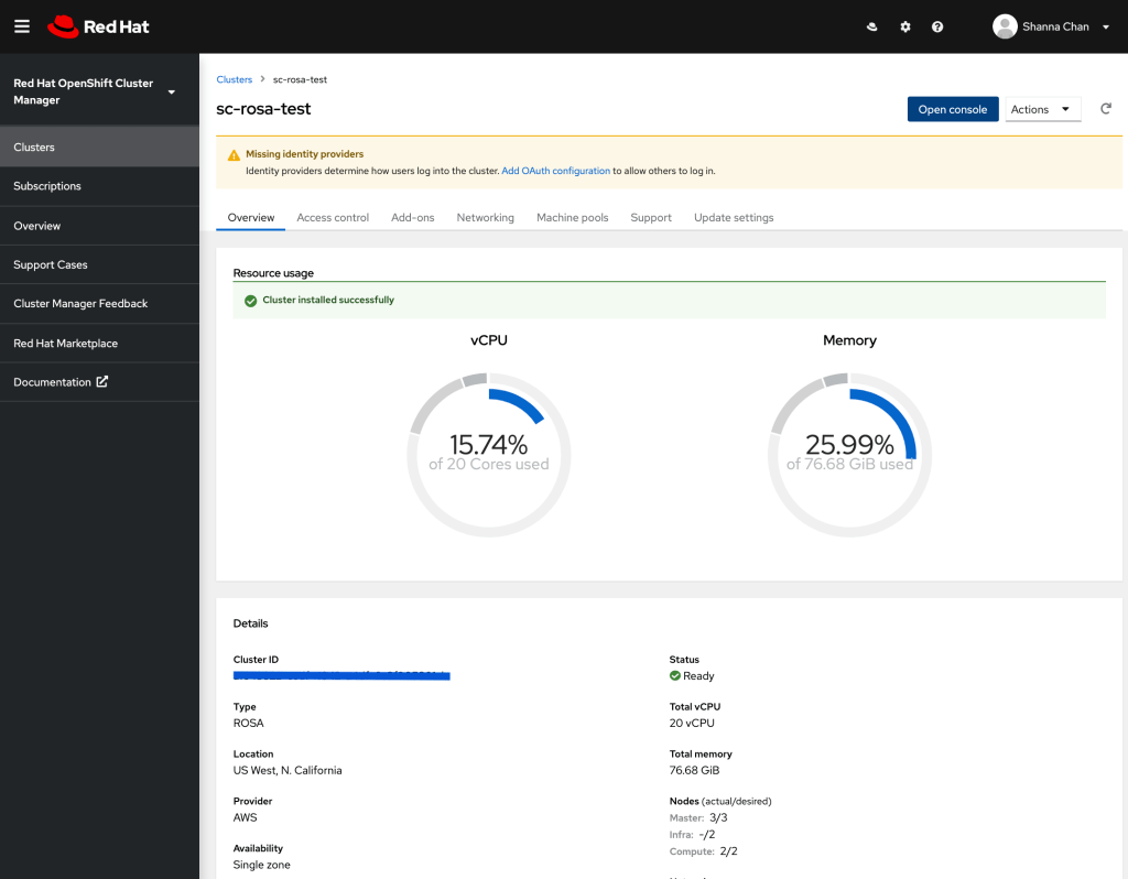 Details Pageto a browser and you can view the status for your ROSA installation.