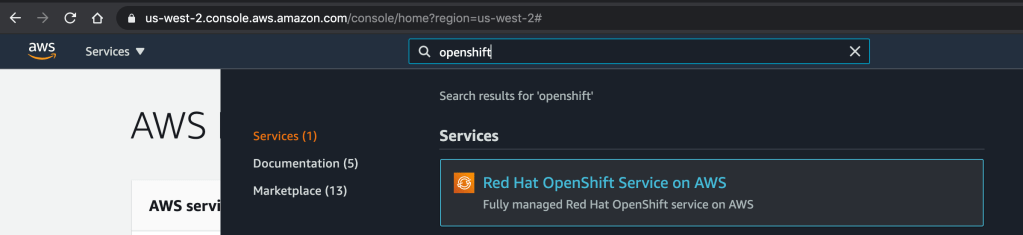 After logging into AWS, enter openshift in the search box on the top of the page.