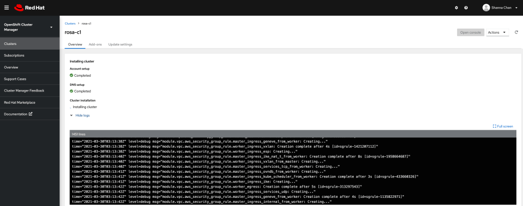 I: To watch your cluster installation logs, run 'rosa logs install -c rosa-c1 --watch'.