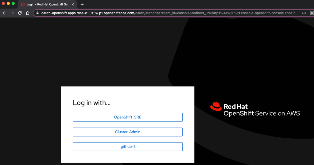 Open a browser with the URL from the IDP configuration. Our example is: https://console-openshift-console.apps.rosa-c1.xxxx.p1.openshiftapps.com.
