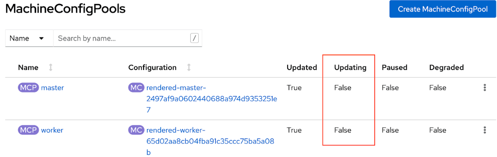 - Verify that all machine config pools display a status of Up to date and that no machine config pool displays a status of “UPDATING.”