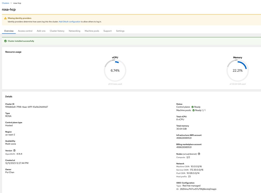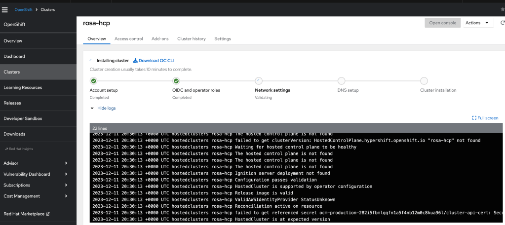 - Click on to the cluster name and view logs or run run ‘rosa logs install -c rosa-hcp –watch’ in the CLI